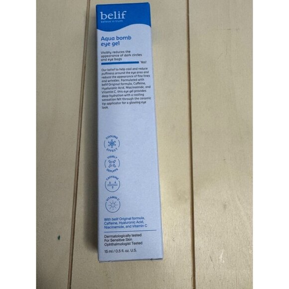 Experience revitalized eyes with belif Aqua Bomb Cooling Eye Gel. This lightweight gel reduces puffiness and hydrates with caffeine and hyaluronic acid, while niacinamide and vitamin C target dark circles. Adenosine and collagen work to plump and firm, providing a refreshed, youthful appearance.