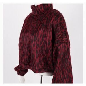 bershka womens red black leopard print crop fuzzy turtleneck sweater small.