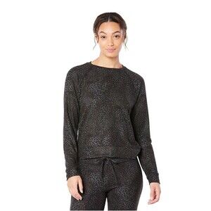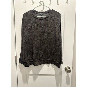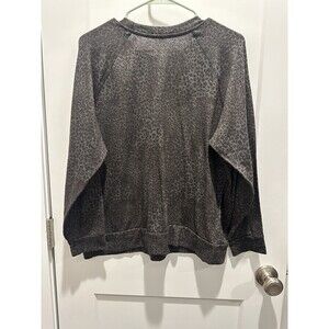 The product is a women's oversized crewneck sweatshirt by Beyond Yoga in size 1X. It features a classic black color with a cheetah pattern, long sleeves, and a pullover closure. Made of polyester, spandex, and rayon knit fabric, this sweatshirt offers stretch for comfort. The style is designed for activewear, with a crew neck and an oversized fit, perfect for a sporty yet classic look.