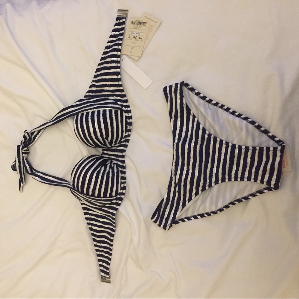 navy, silver & white bikini. supportive lightly padded top. brand new US size 6 top size 4 bottom.