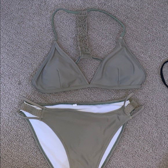 camp greenish bikini, cute back on top, cute straps on bottom, i love this swimsuit it’s just too small