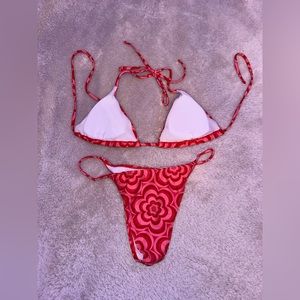 cute flower pattern bikini. top is basic triangle style with ties at back and neck and bottoms are just plain sides. comes with skirt with matching pattern.