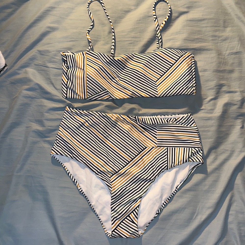 striped bikini, high waisted bottoms