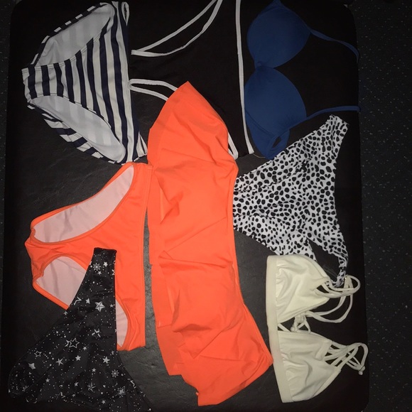 bikini bundle all are size small except the black star botgom is a medium and the blue and white striped is a kids 10-12 (fits like a normal small)