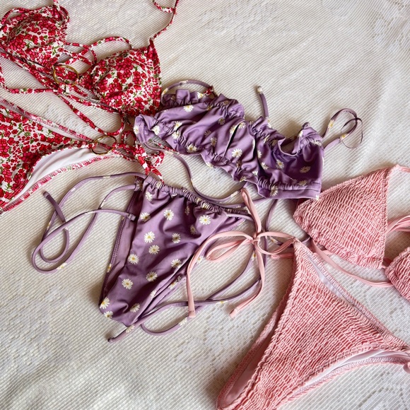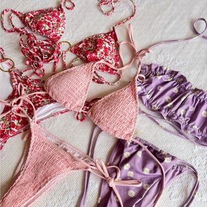trio of gently worn tie bikinis. tags cut out, because i always do with swimsuits, but they are all size xs.