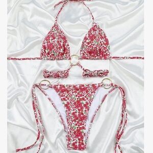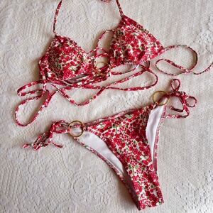 the red floral bikini ties at neck and around the waist. o-rings have slight tarnishing from the ocean salt, but no other flaws.
