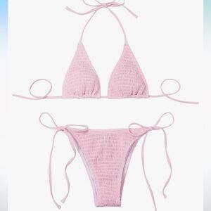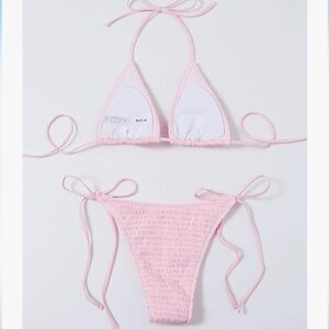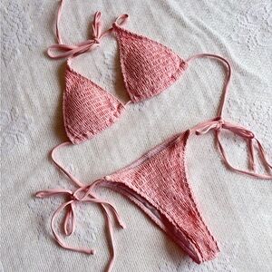 the pink scrunch bikini ties at neck and back. classic tie triangle cups, with high cut tie bottoms. cheeky bottoms.