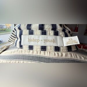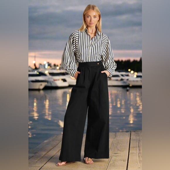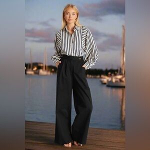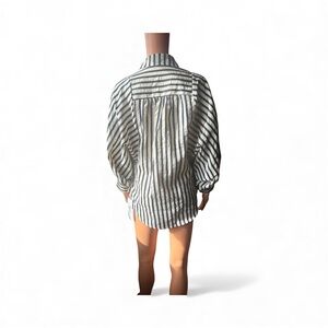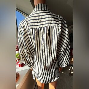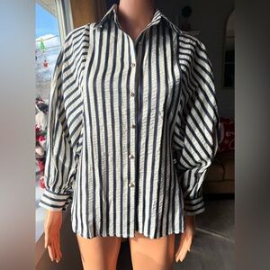This stylish button-down blouse features a classic vertical stripe pattern in navy and ivory, creating a clean and timeless look. Designed with a relaxed silhouette, it includes gently puffed sleeves and cuffed wrists that add a touch of elegance and volume. The fabric has a subtle textured sheen, giving the piece a refined finish. With its pointed collar and lightweight feel, this blouse is perfect for both casual and dressy outfits, offering comfort and sophistication in one versatile garment.