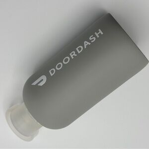 This bkr Little Glass Bottle features a 500ml (16oz) capacity and comes with a stylish gray DoorDash sleeve. It's perfect for those who appreciate both functionality and sleek design in their hydration gear.
