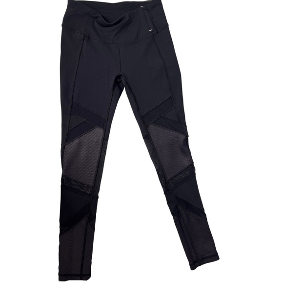 Mid-rise Black leggings with mesh leg detail. Small hidden waist pocket. Additional details: