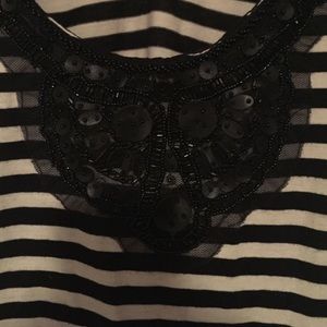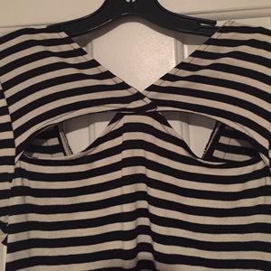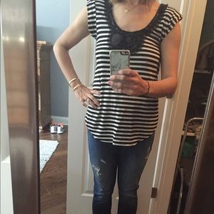 Collective concepts black and white striped shirt with black leather necklace like embellishment on front neckline. Short sleeve and racerback style cut out in back. Adorable with white jeans!