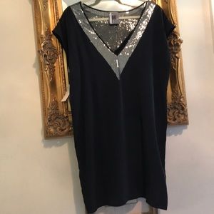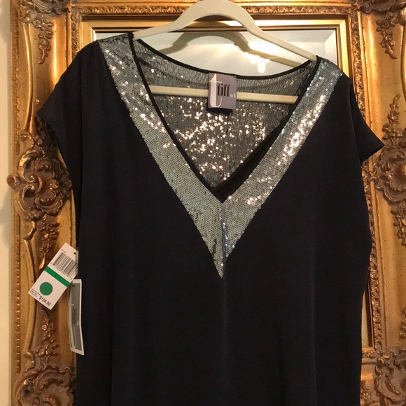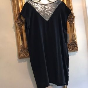 black dress with v cut in front and sequin details on both the v and the back collar or the dress. great for new years! never been worn.