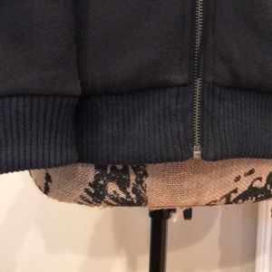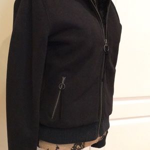 bBlack hoodie jacket with black fur interior. Zipper with loop accents and ties.