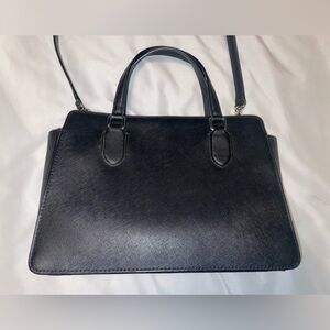 about 12 in x 8 in x 5 in, some spots on the exterior leather & rips in the fabric inside but nothing serious, still has a lot of life left in it, also some tarnishing on the metal hardware as shown in photos, has adjustable shoulder strap that is removable as well as hand held straps, large zipper compartment in the middle with smaller zipper pocket & open pocket inside, 2 button compartments on the side