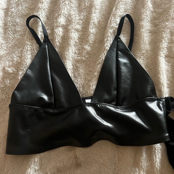 black leather top, cropped tight fitting. fits a large but can adjust the straps. i’m size 34c for reference and it fits me well.