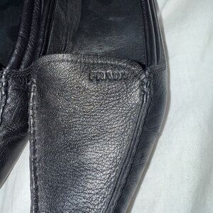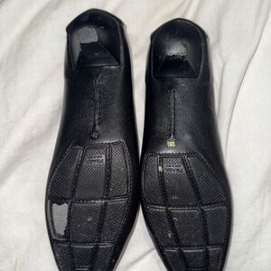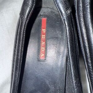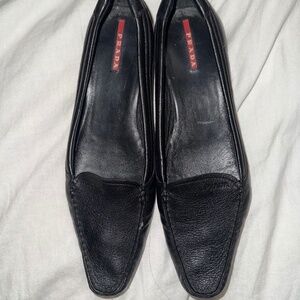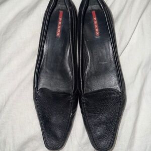 The shoes in the image are a pair of black Prada kitten heels. They are a slip-on style with a low, slender heel and a square toe. The shoes have a pebbled leather texture and a red tag with the "PRADA" logo on the insole.