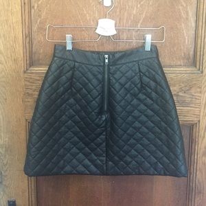 black quilted faux leather skirt from Topshop, only worn once. it has two front zippers that are real pockets, back zip, and is fully lined. waist is about 13", length is about 15". size US 4
