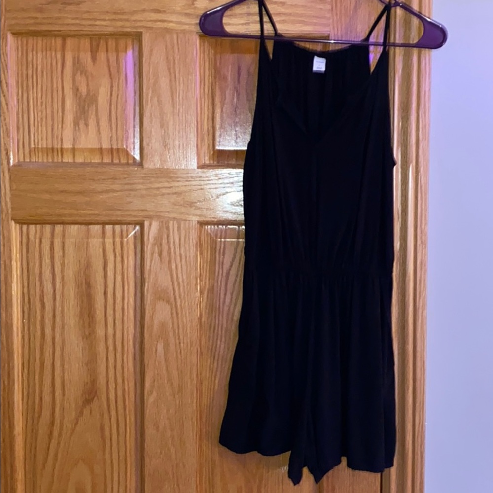 black romper with a little button at the top of the V neck