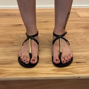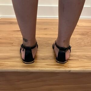 - flat, but with a quarter-inch raised heel, with a gold accent around the "heel"
