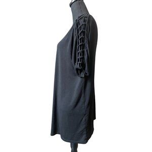 black tunic double V short sleeve open weave ladder accent swim cover top