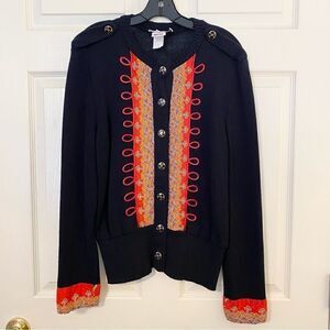 women black sweater cardigan button up red trim shoulder strapgreat condition
