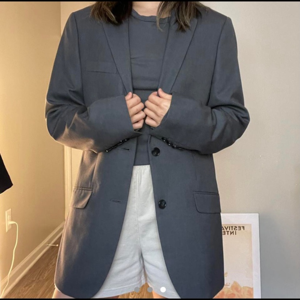 men’s slim fit blazer size small! like new, no flaws, never been worn by me! i’m usually a size s and it’s an oversized fit on me