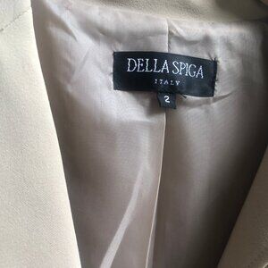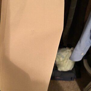 Lined light bone color blazer. pit to pit 19", length 25". you can fold up sleeves for a cuff. tiny cut (less than 1/4") in sleeve. see photo #5. fabric glue would probably do the trick. I never bothered to fix it because it really doesn't show when you have it on. will fit a size 4-6 as well.