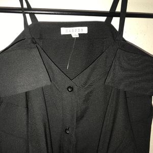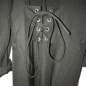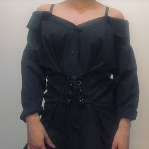 this is a Botton down blouse with and open shoulder and a corset like in the middle. this blouse has never been worn. new but I took the tag off. the price is settle on this one.