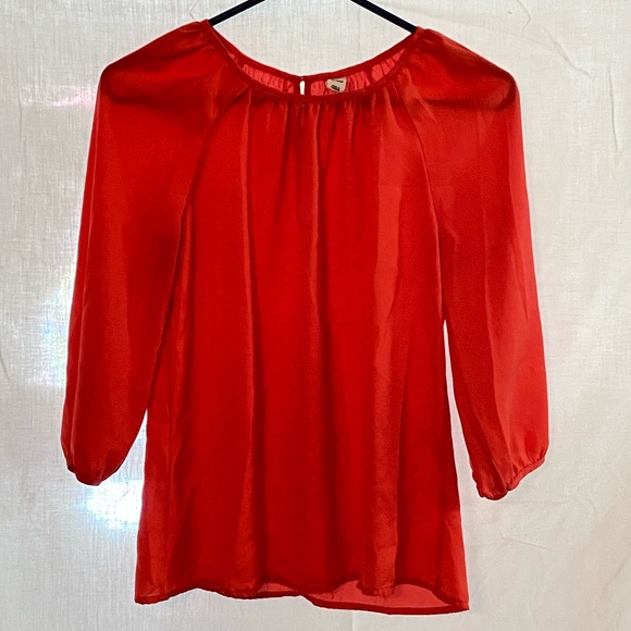 3/4 sleeve blouse with button in back on top. looks red but really a darker pink.