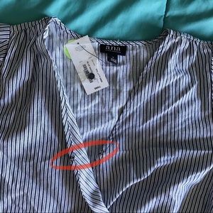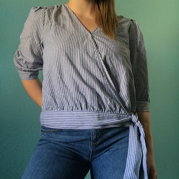 this wrap-front top is so cute!! but i can’t wear it because it’s too small in the chest :( i got this as a gift and it just doesn’t work for me. it’d be perfect for any business casual events or just paired with jeans. the tie at the bottom helps it to stay in place and fit well. other closures are pictured in images 3&4 :) this garment is new with tags!