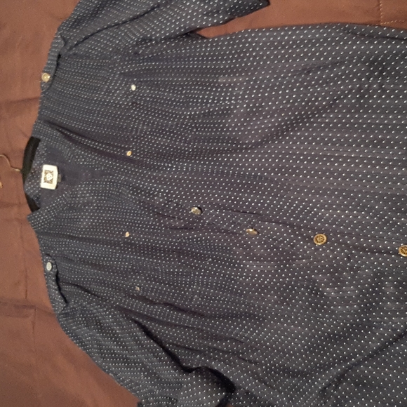 Navy with white dots and short cuffed sleeves. No collar, lay's in a v shape neckline.