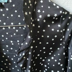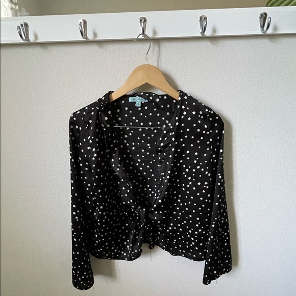 fun star print blouse! silky and can be worn in different styles because of the tie in the front!