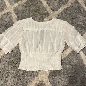 Ruffled off white shirt that’s cinches at the waist. Can be buttoned up higher than shown.