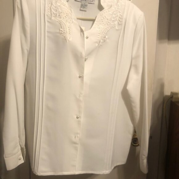 Dressy white button down blouse with pearlized buttons. Embroidery at collar
