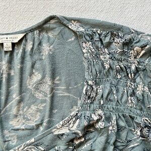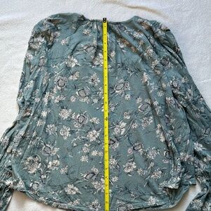 Flowy A line pullover floral shirt, v-neck, long sleeve with flare detail, ruching on the shoulder and sleeve. Blue-grey in color, very roomy.