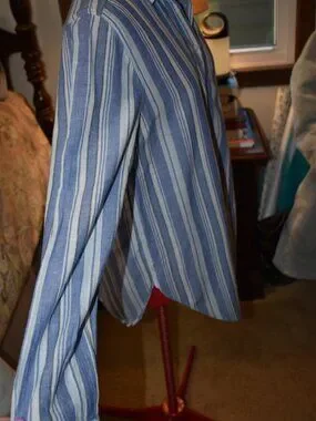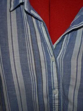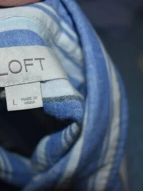 This is a long sleeve blouse from Loft in a size Large. It is a striped blouse with colors of blue, white etc. Pit to pit it is 21 1/2 inches and from the top to bottom down it is 28 inches. It is 46% cotton, 40% rayon and 14% linen. It is gently worn and in great shape.