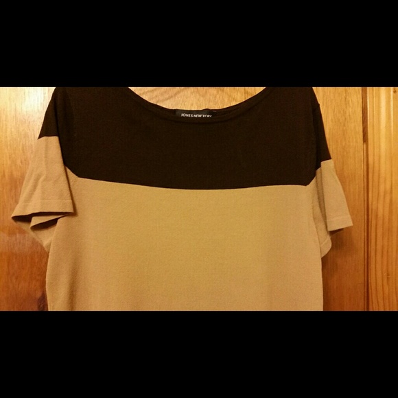 beige /brown short sleeve with dark brown at top and bottom with red stripe approximately 1 1/2 ices above dark brown
