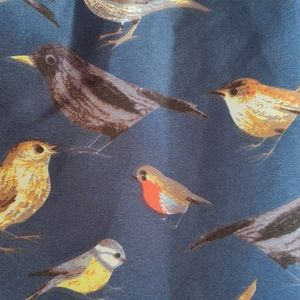 flouncy with a cute bird pattern, this blue bird print skirt is an easy way to pull together an eclectic, elegant look. unlined but not see through! pleats, flat front elastic waist, side zipper. polyester. EUC, worn 4 times over 2 years.