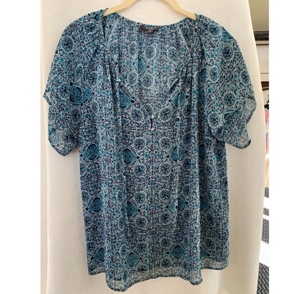 NYDJ Los Angeles blue patterned short sleeve blouse. tie and two buttons in front. Size Small. Able to measure with a tape measurer if requested. Like new condition. Originally about $89.