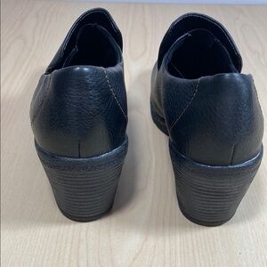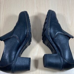 These boc heeled boots in classic black leather feature a sleek slip-on design with a chunky medium-height heel, perfect for both casual and business settings. Crafted from smooth leather with a matte finish, they offer a clean and professional look. The rounded toe box and practical heel height ensure comfort for everyday wear.