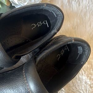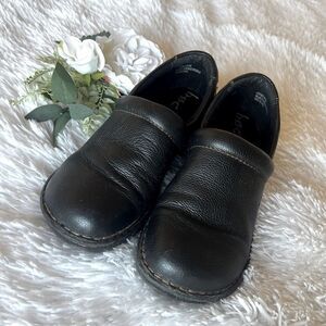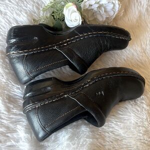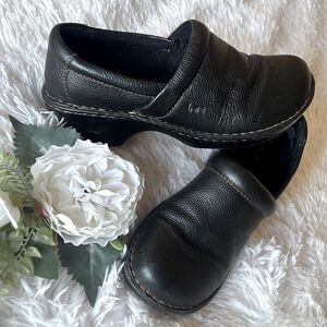 Super comfy genuine leather clog/nursing shoe by b.o.c. Black pebbled leather. Slip on. Padded collar. Cushioned footbed.