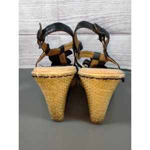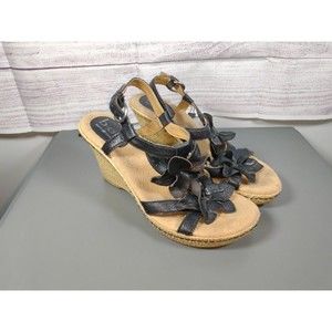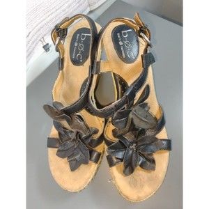 Pre-owned and in very good condition. b.o.c. Born Concept black wedge heel sandals. Leather upper, stacked wooden heels. Straps around ankle. Normal signs of wear on the instep and bottom soles. Buckles on each shoe works great. No signs of excessive wear. Weaving is all intact with no snags or breaks on each heel. All leather flowers and straps are in great condition.