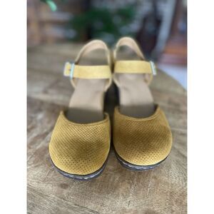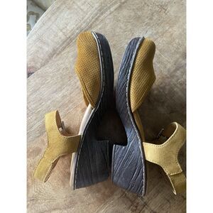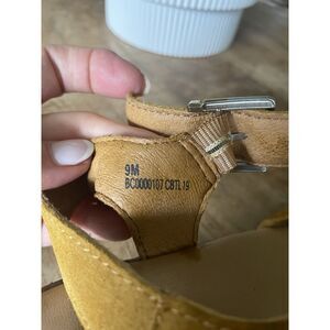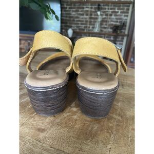Women’s b.ø.c Born Concept leather sandals in mustard yellow. Mary Jane style with adjustable buckle strap, perforated leather upper, cushioned footbed, and wood-look block heel. Size 9M. Heel approx. 2”. Preowned, overall good condition, minor wear on soles. Please see photos for details.