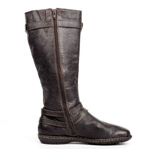 Stylish dark brown leather combat boots. Features buckle accents and side zipper. Durable and chic for everyday wear.