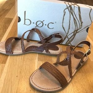 NEW! Look dressy and trendy in the Dena Sandal from B.O.C. Faux-leather upper in a comfy sandal style with an open toe. Crisscrossing braided straps with adjustable buckle closure strap. Soft lining with comfort footbed and durable traction outsole. Never worn, NWT.