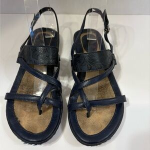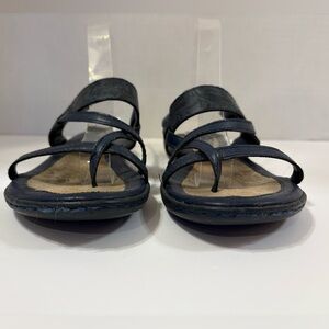 Strappy sandals have side buckle closure.  Lovingly worn with signs of wear.