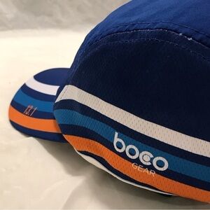 D8 Hat/Cap Boco Gear Adult Special Adjustable Strap with Clasp Adjustable Strap with Buckle Runners High Club type logo on face in white and 26.2 and 13.1 on RL of bill and boco on L rear quarter/Blue crown with orange white blue stripes across both sides and bill. 100% Poly