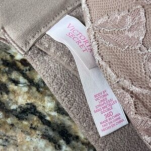 The product is a Victoria's Secret body by Victoria lined strapless bra in tan color, designed for women in size 36D. This underwired bra features a solid brown pattern with accents of lace, strap, and bow. Made from a blended fabric of polyester, nylon, and spandex, it offers a push-up style with a back closure and adjustable straps. The bra belongs to the designer, angel, and classic themes, making it a stylish and comfortable choice for everyday wear.