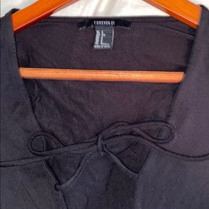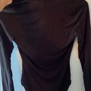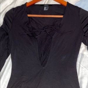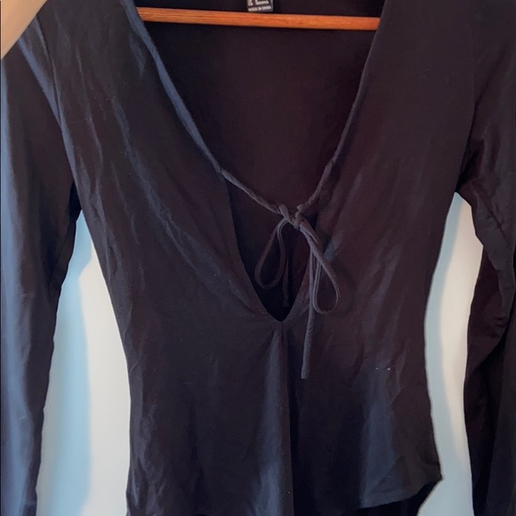 Black bodysuit with a slit in the middle. Never worn. Ties around cleavage area. Black bodysuit that clips together