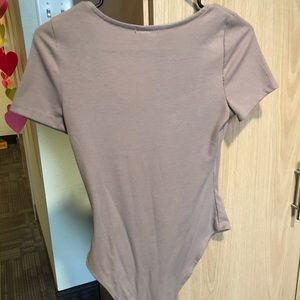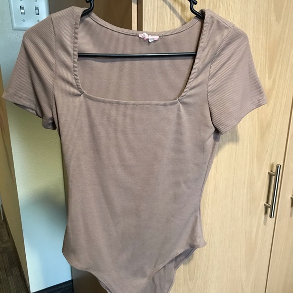 it’s the perfect tan/nude color! it buttons at the bottom & it made of really nice material. the neck line is square in the front & it is short sleeve